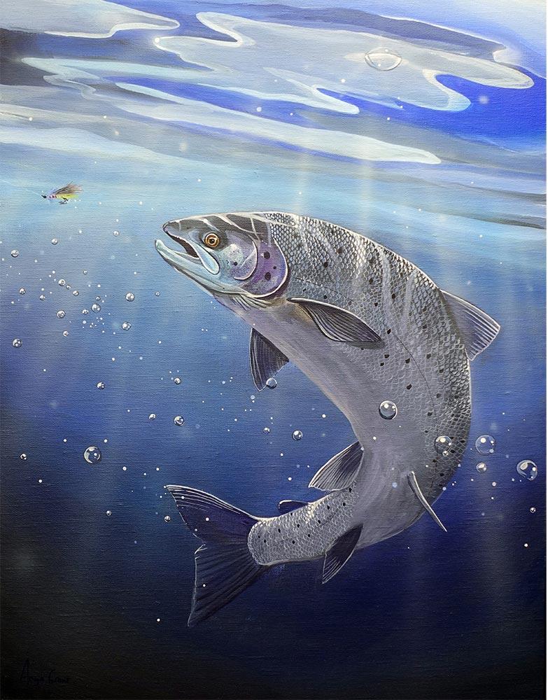 Metal print of Superfly, Angus's painting that depicts the magic of a fly luring a salmon. The underwater effect is recreated perfectly on the shiny surface.